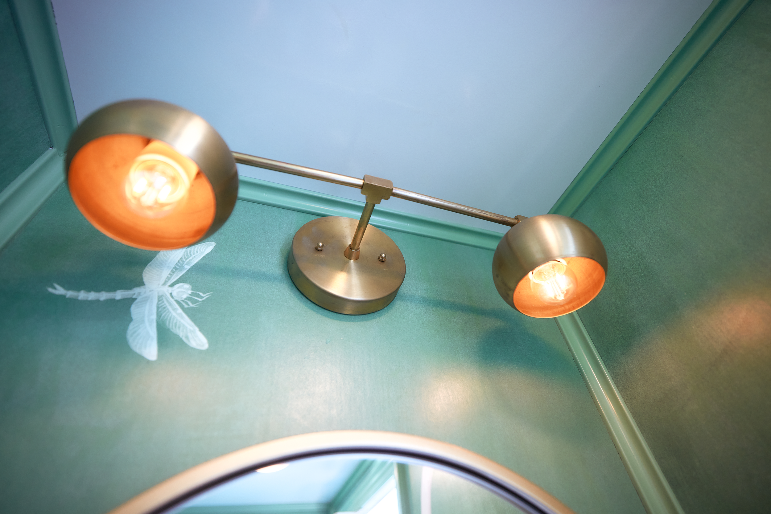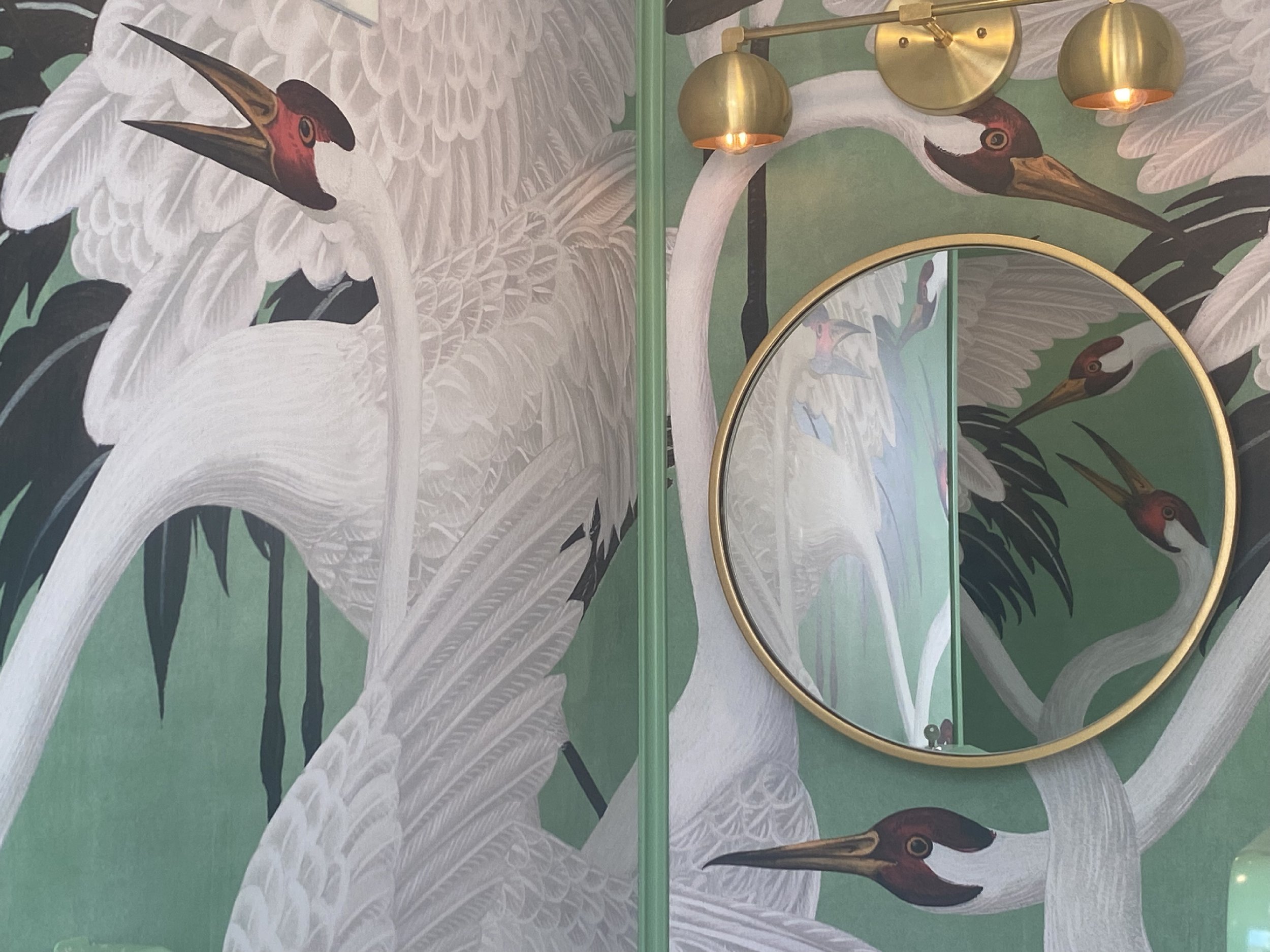 Designed using the Heron print wallpaper by Gucci. Featuring a custom hand-placed wainscoting, brass fixtures, and mahogany finishes.