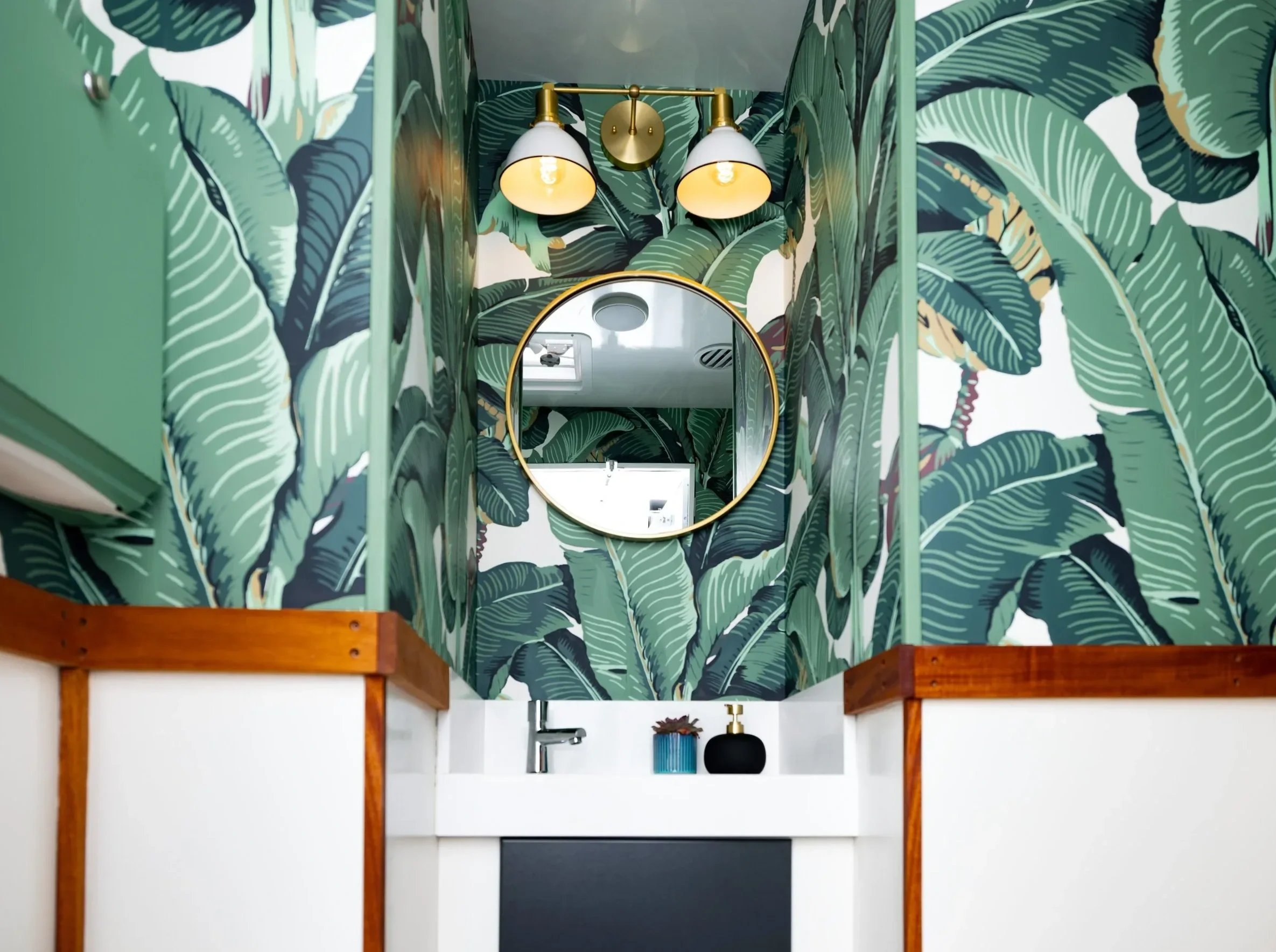 Designed using the iconic Martinique wallpaper by CW Stockwell. Complimented by rich African Mahogany throughout.