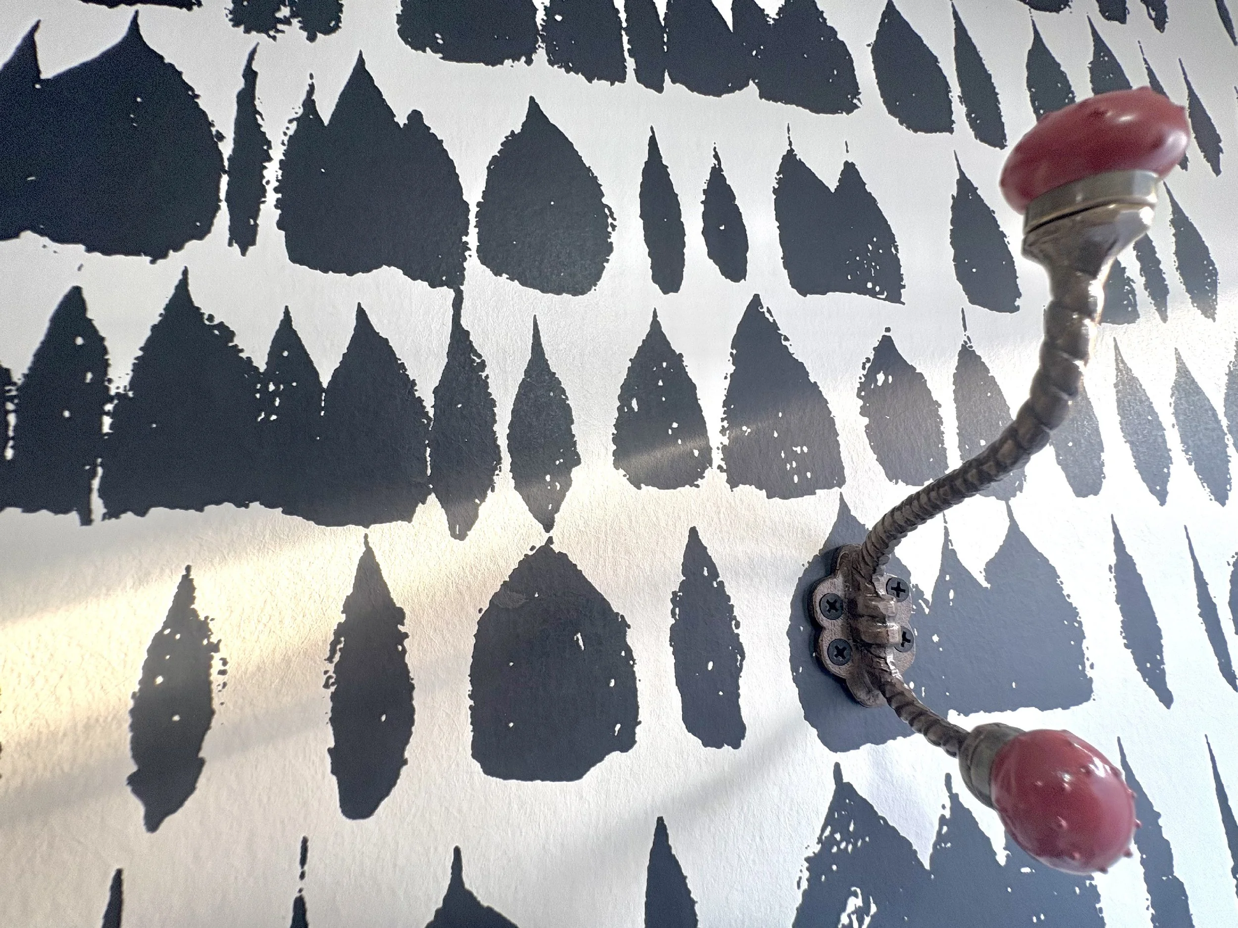 Designed for the vintage Queen Of Spain Wallpaper released by Schumacher in 1963. Featuring the ARCS mirrors designed by Muller Van Severen in bold contrasting red. Fixtures by RH.